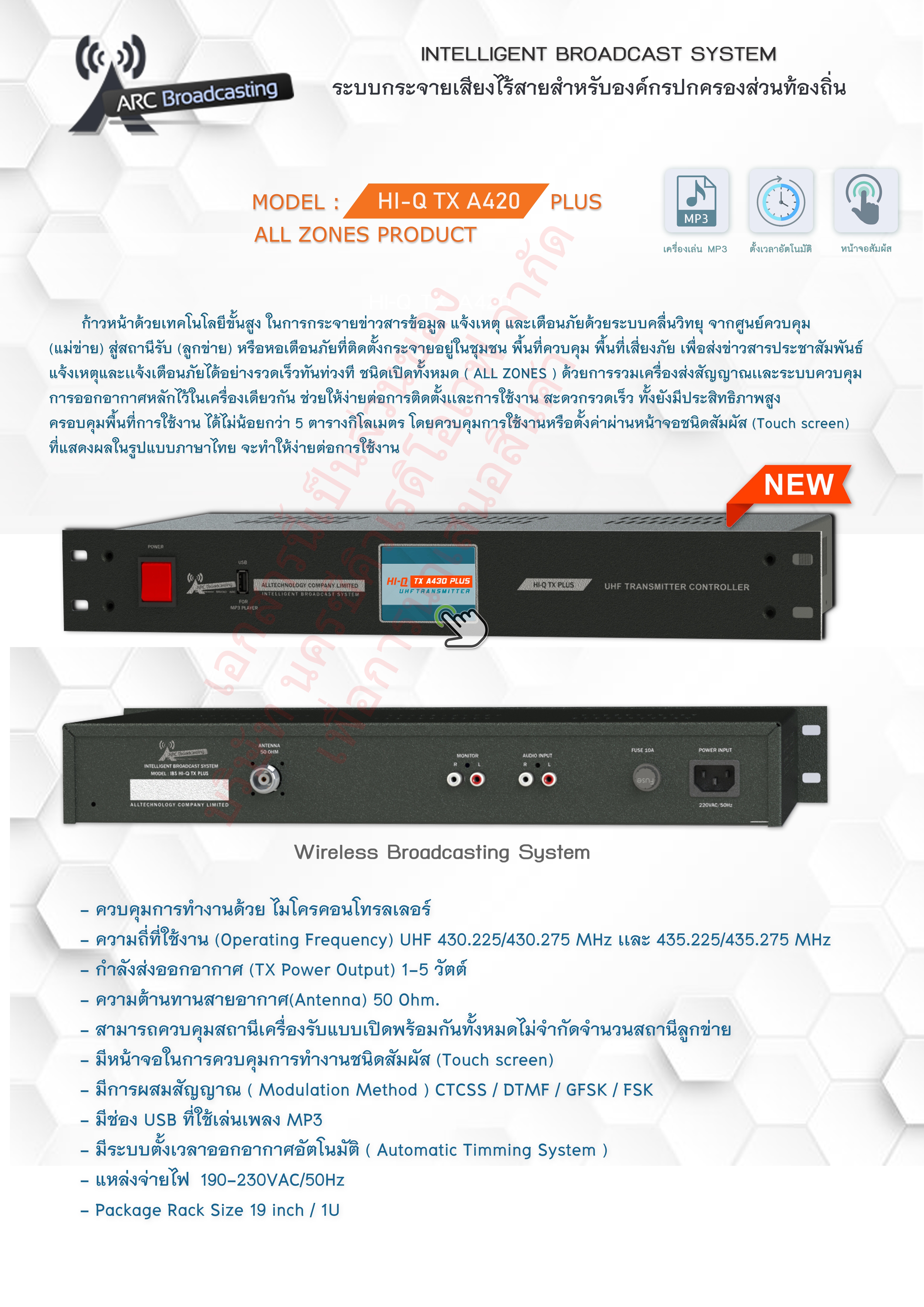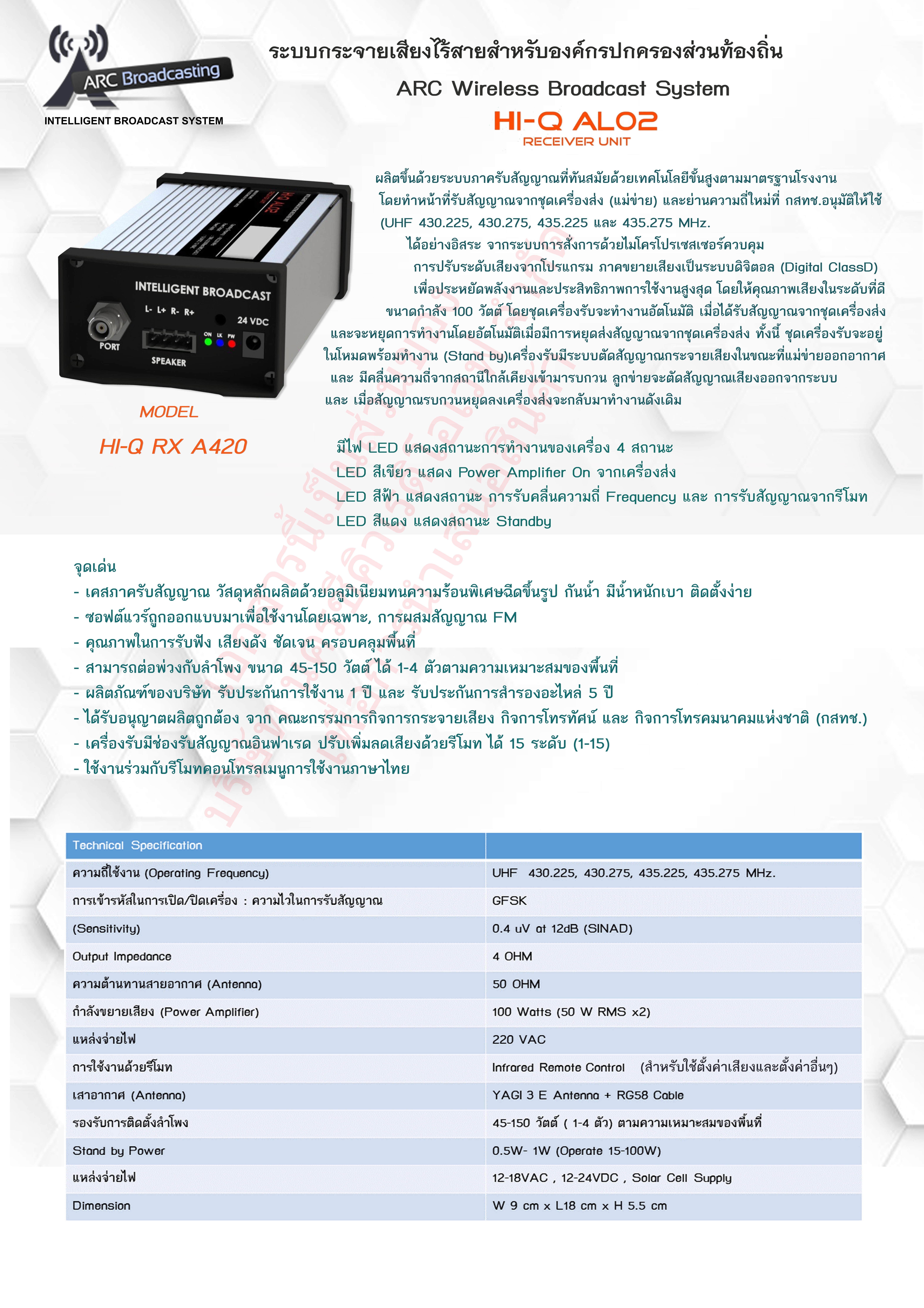 ระบบกระจายเสียงไร้สายสำหรับองค์กรปกครองส่วนท้องถิ่น รุ่น ARC Hi-Q TX A420